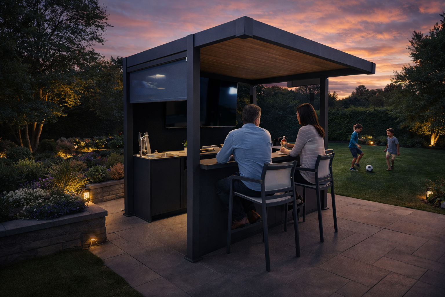 By integrating overhead structure with preparation space, the garden gains a clear centrepiece rather than a standalone utility area.