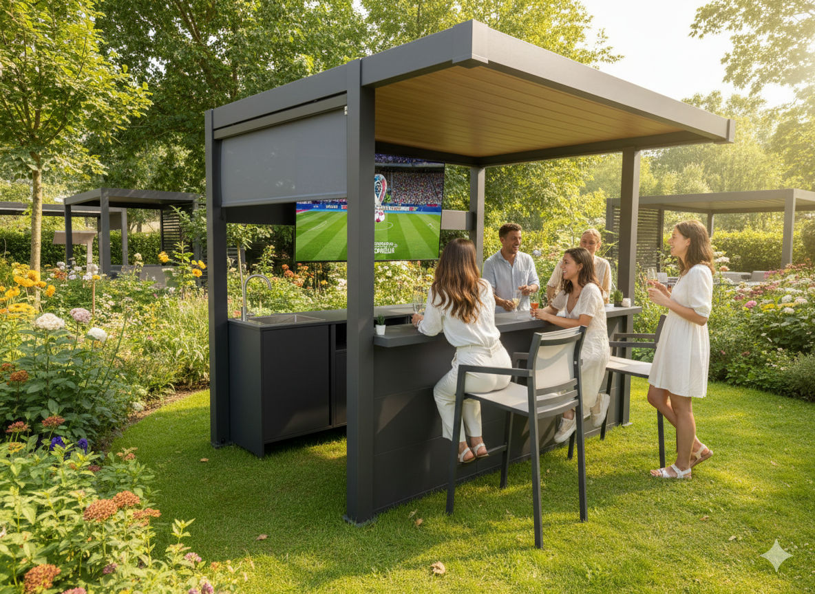 Pergola kitchen suites combine architectural shelter with practical outdoor cooking and hosting space. Designed for contemporary gardens, aluminium pergola kitchens create a defined social zone with integrated bar and preparation areas beneath a structured roof system.