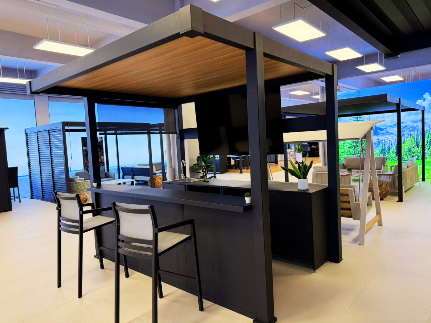 Aluminium is widely used in architectural applications because it offers structural strength without excessive bulk. In a pergola kitchen setting, that balance matters. The frame must be rigid enough to support the roof system and integrated features, while remaining visually clean and proportionate within a garden environment.